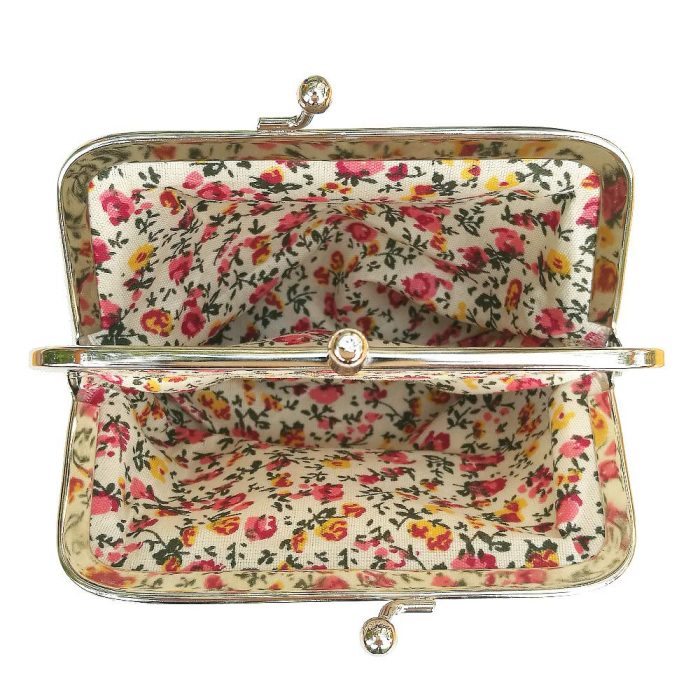 - Material: Made of Canvas with Polyester lining. Clasp kiss-lock closure.